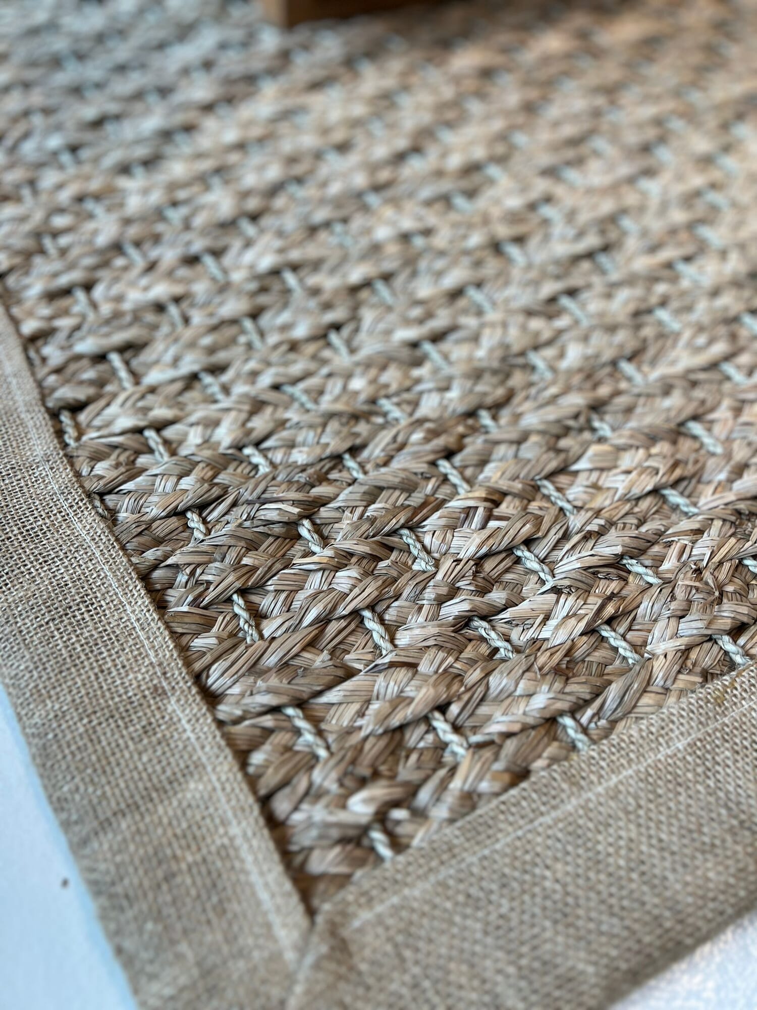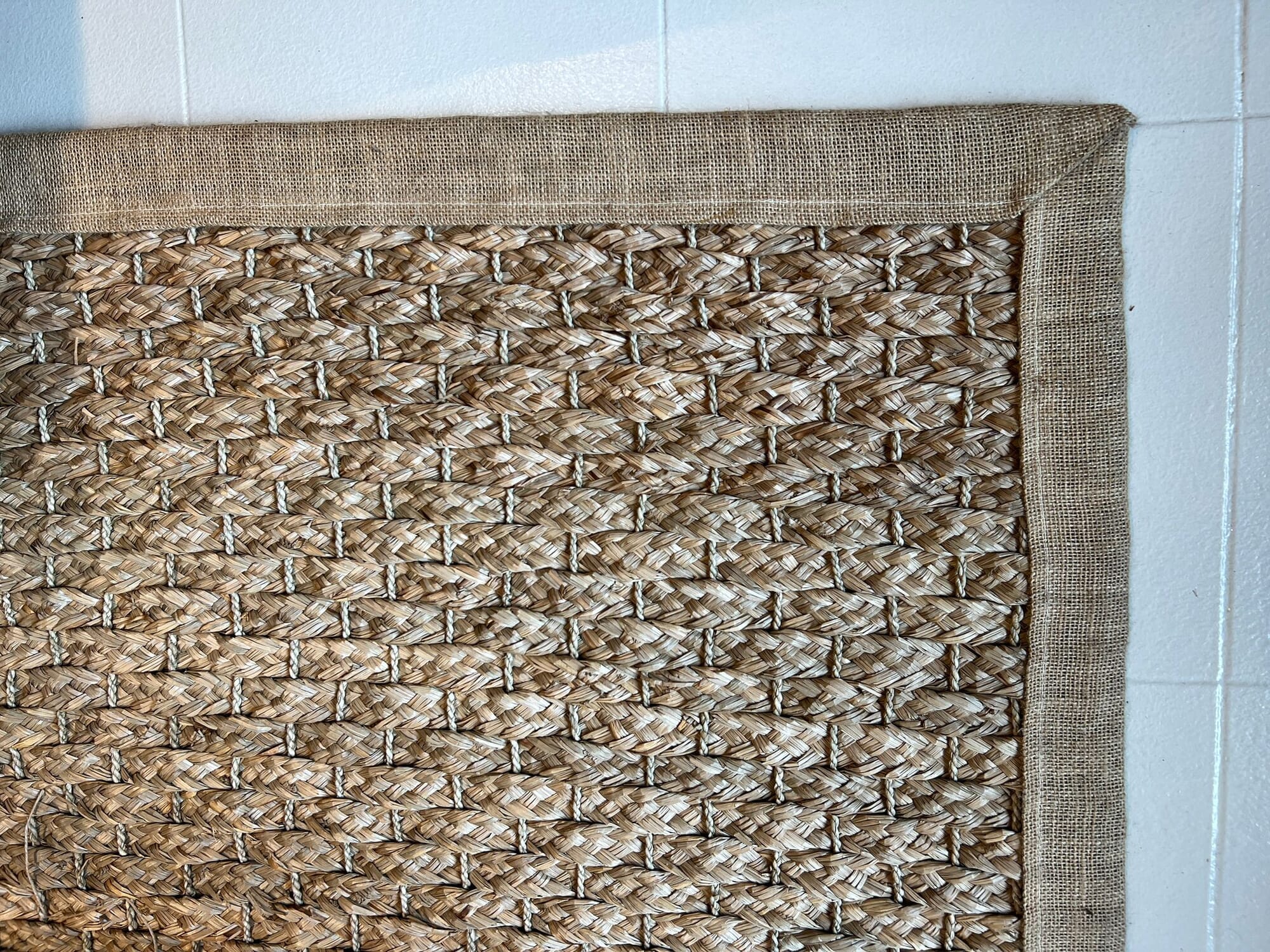 Alfombra en fibras naturales, borde en tela rustica. Medidas: 3 m x 2 m ancho, borde de 6 cm