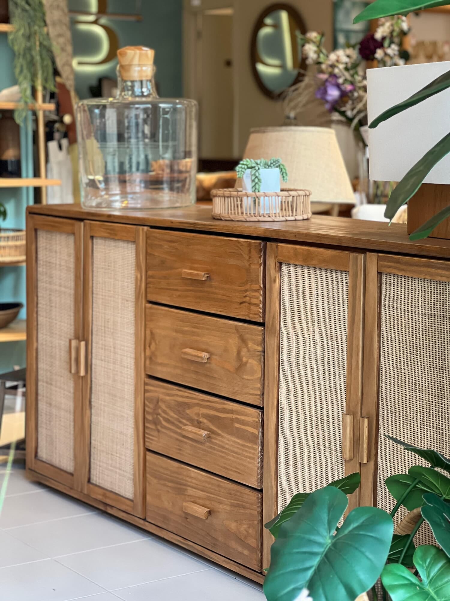 Materiales: madera maciza en álamo con detalles en fibras naturales de esterilla. También se puede hacer en madera de eucalipto. Medidas foto: 200 x 90 x 40 cm. Consultar precio por otras medidas o tipo de madera. . Este producto es por encargue. ·Tiempo de entrega: 20 días hábiles aprox.