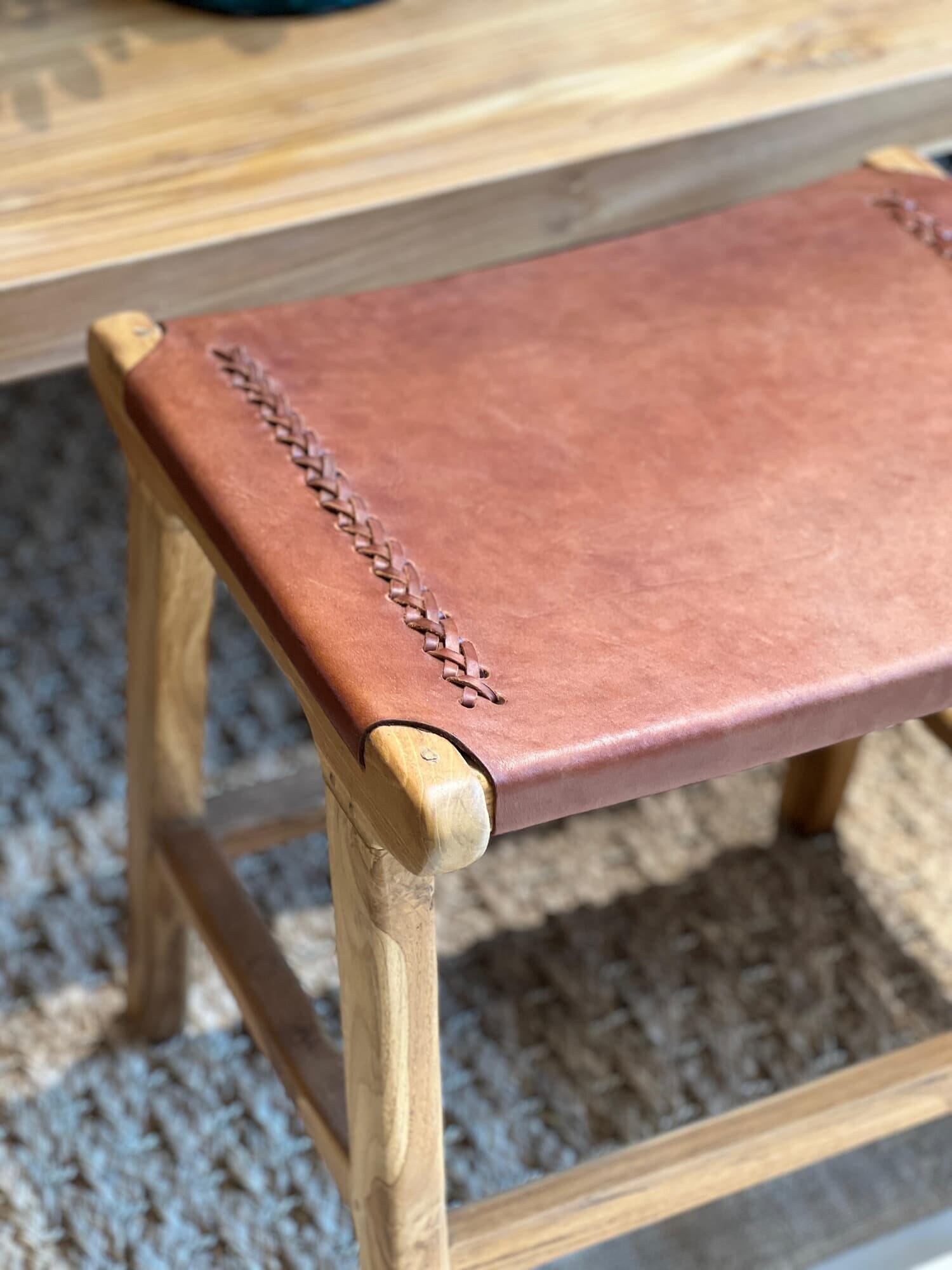 Banco bajo con estructura en madera maciza de teca y asiento en cuero natural. Ideal para mesa