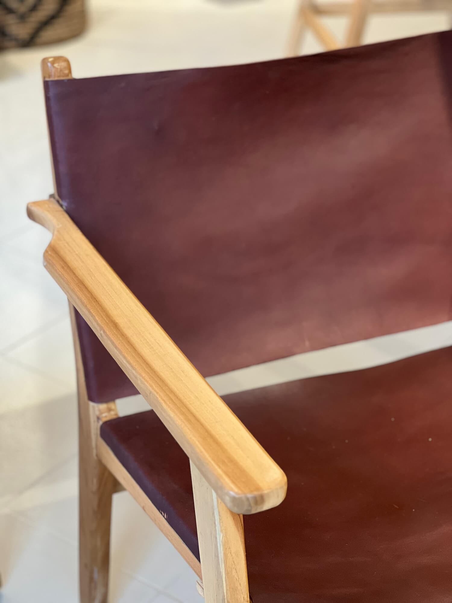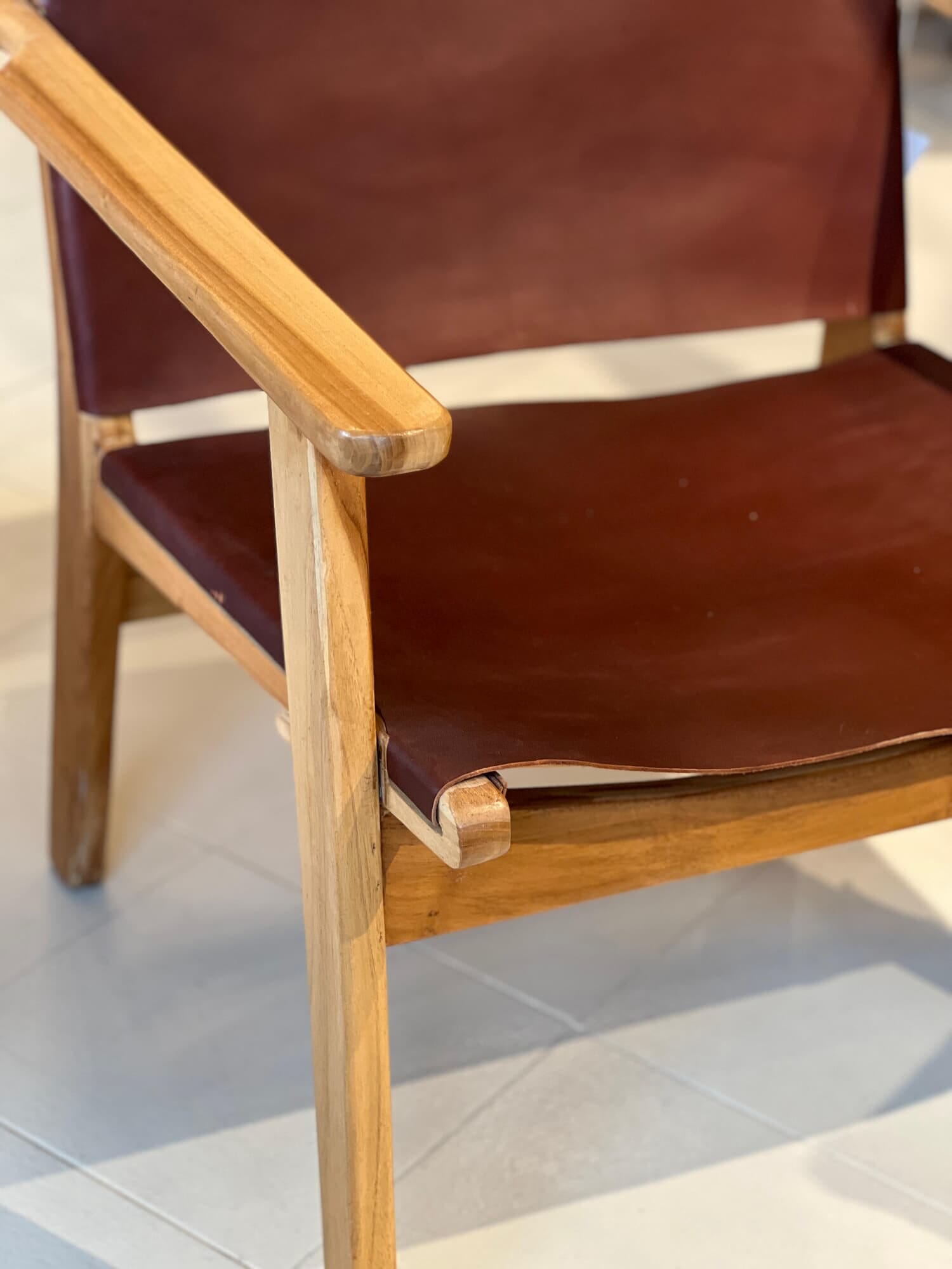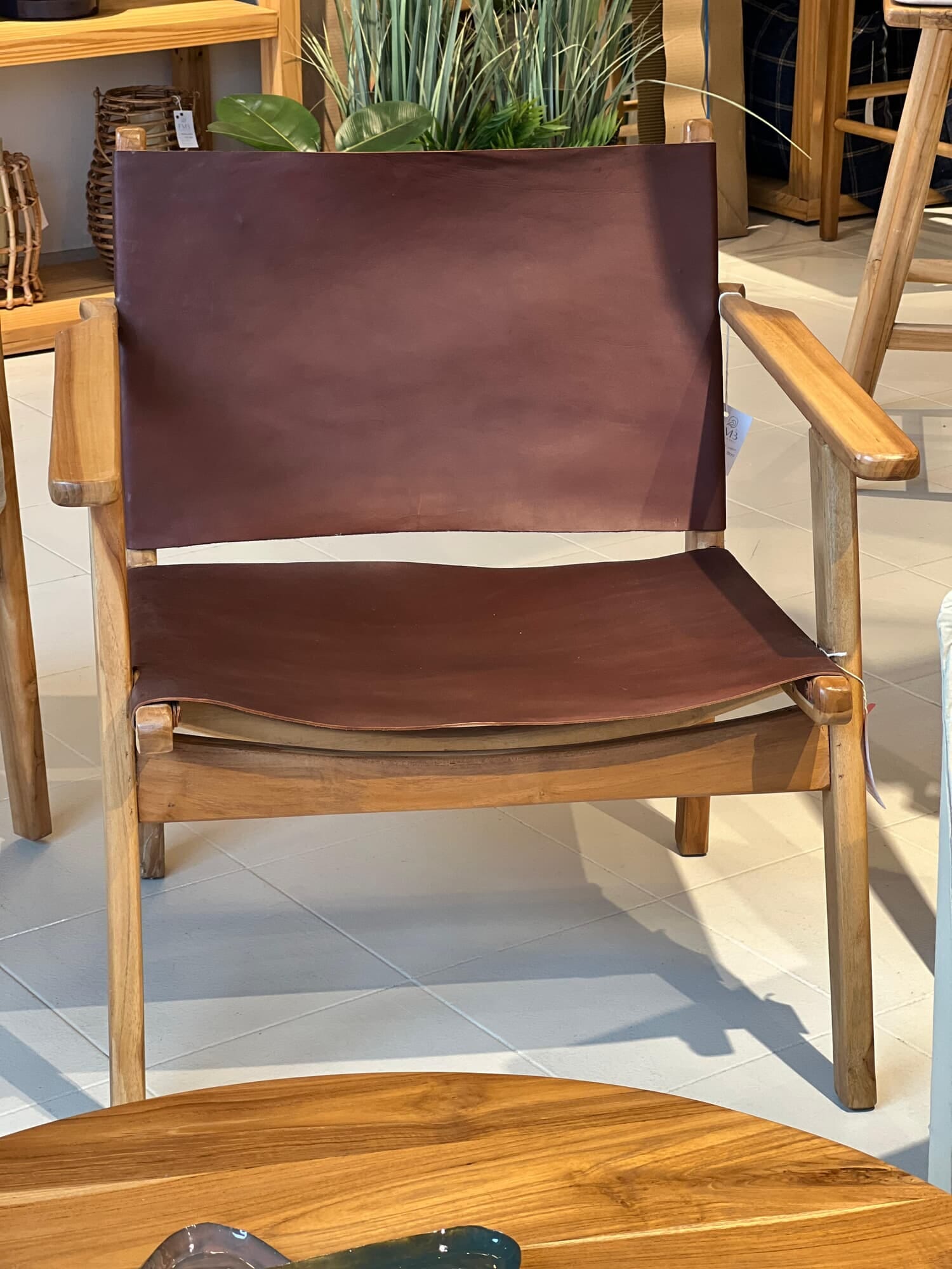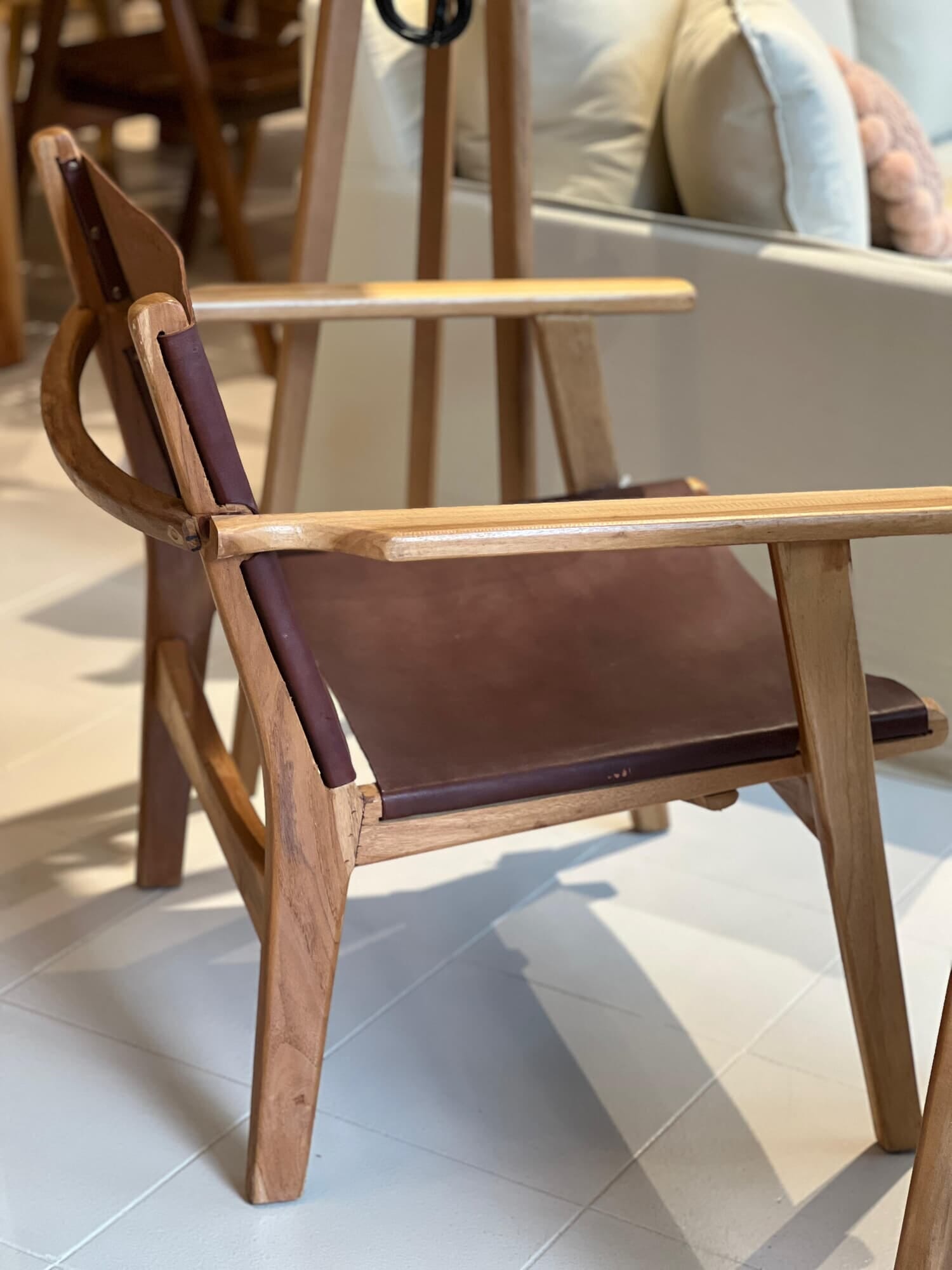Butaca con estructura en madera maciza de teca, asiento y respaldo en cuero natural. Con apoyabrazos