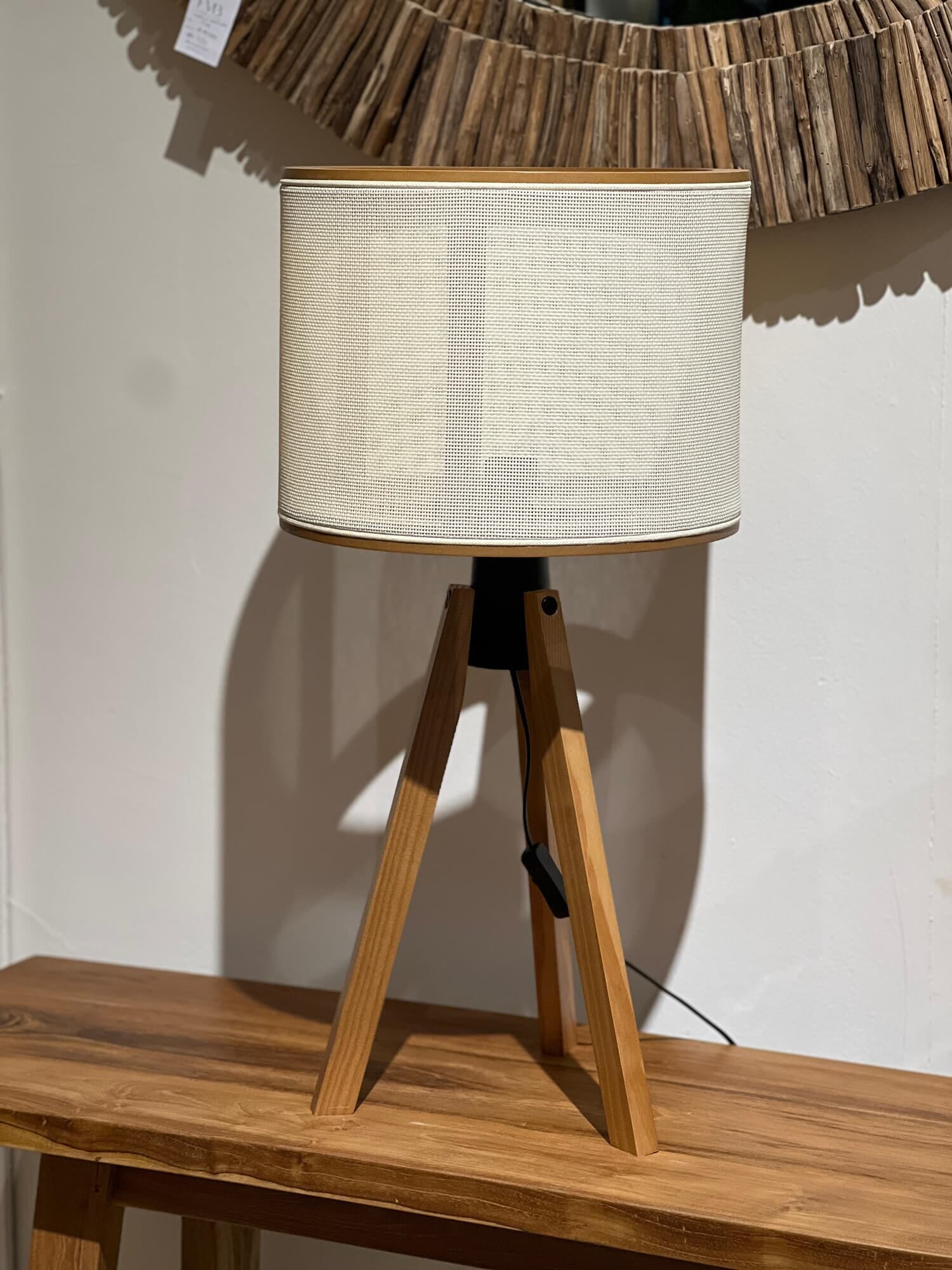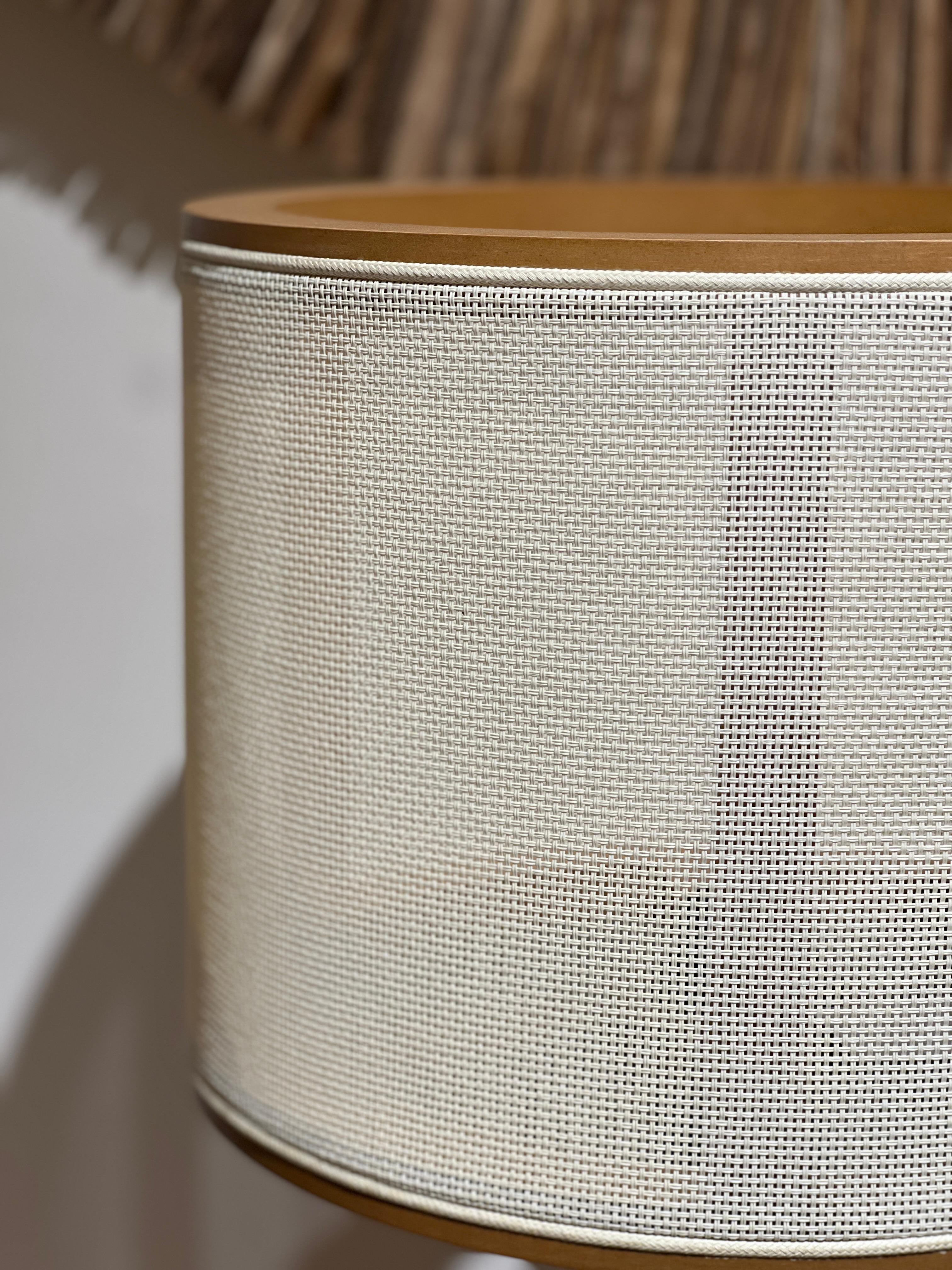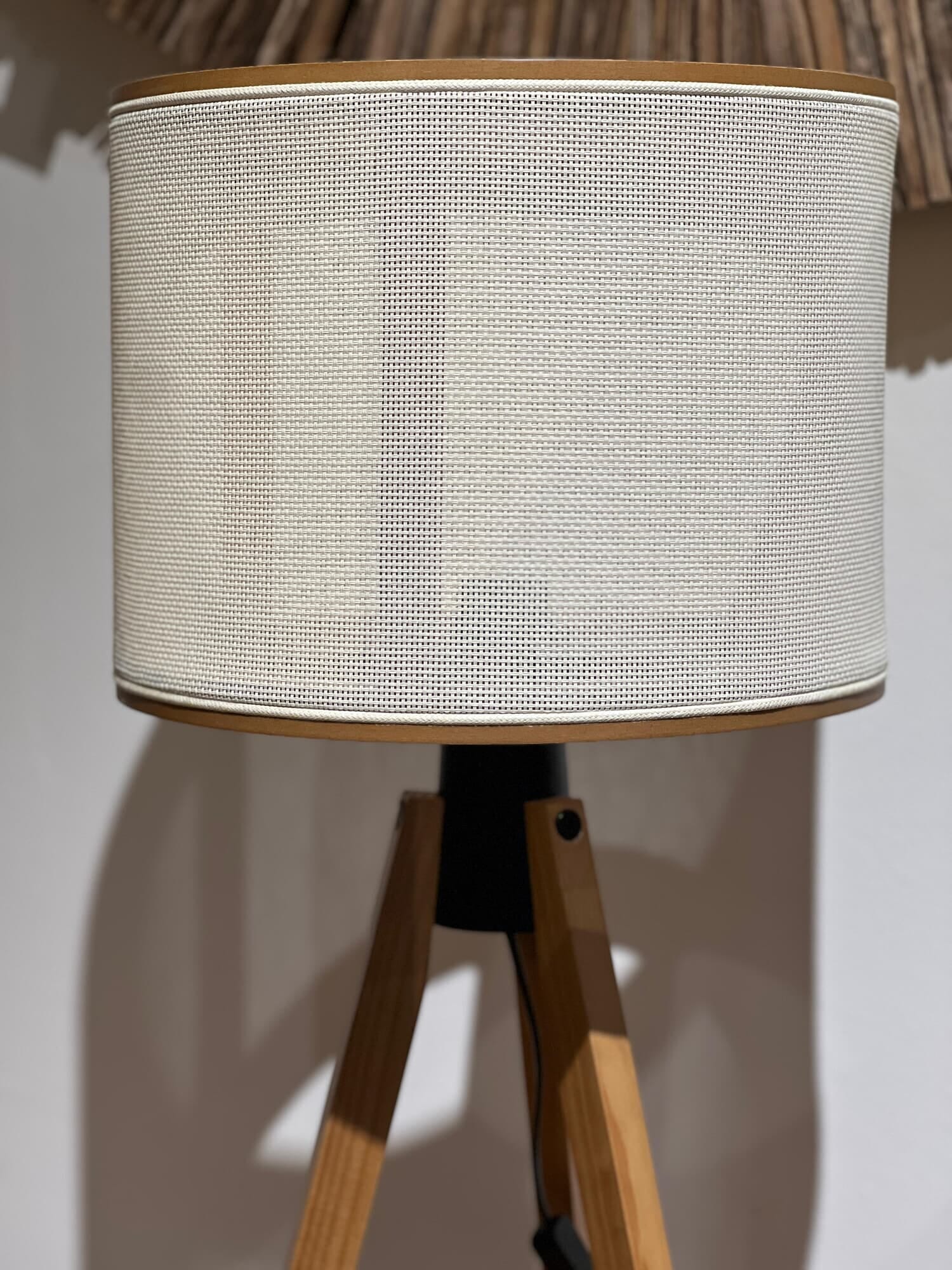 Luminaria de mesa en madera con pantalla en esterilla de fibra natural.