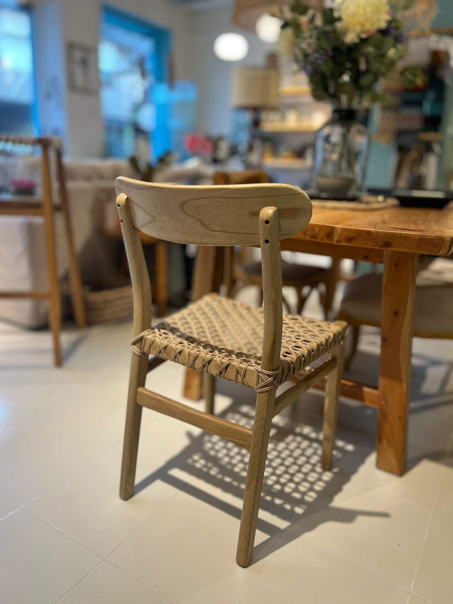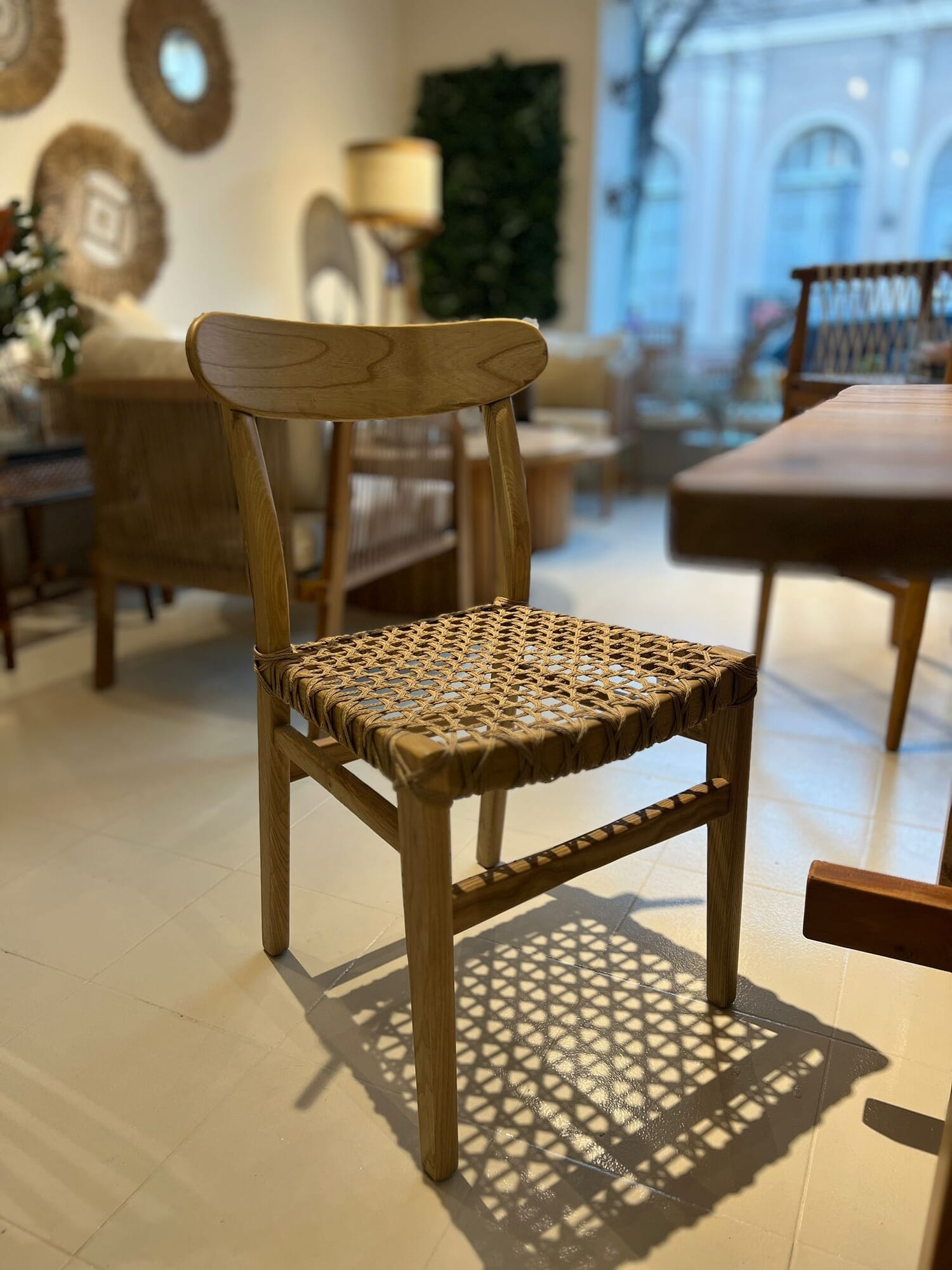 Material: madera de fresno y fibra natural trenzada. Medidas: 46,5 x 48,5 x 80,5 cm
