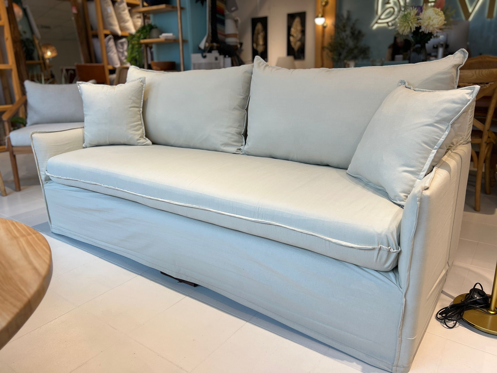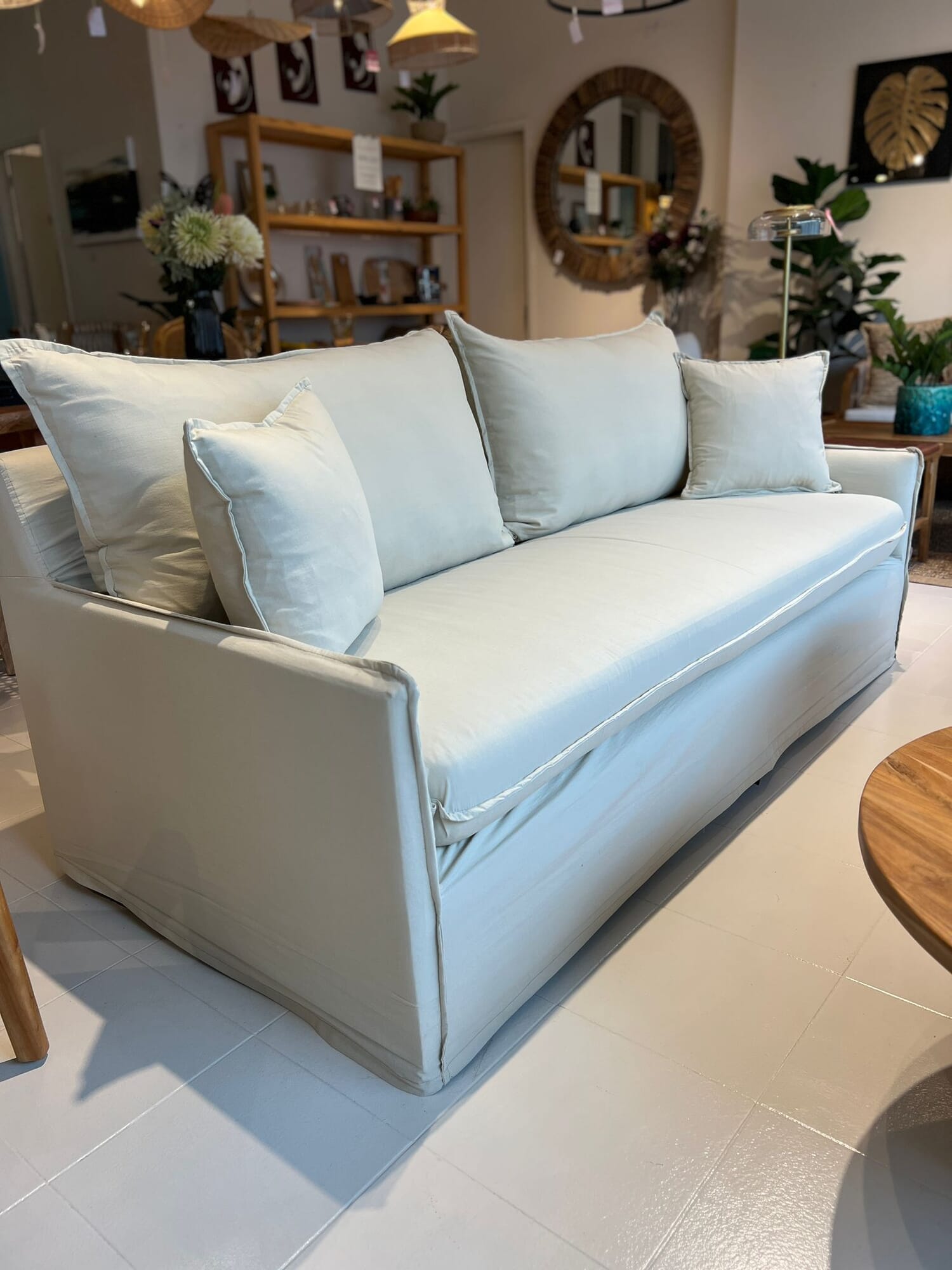 Estructura en madera maciza con fundas en tussor totalmente extraíbles, almohadones rellenos de guata siliconada.
