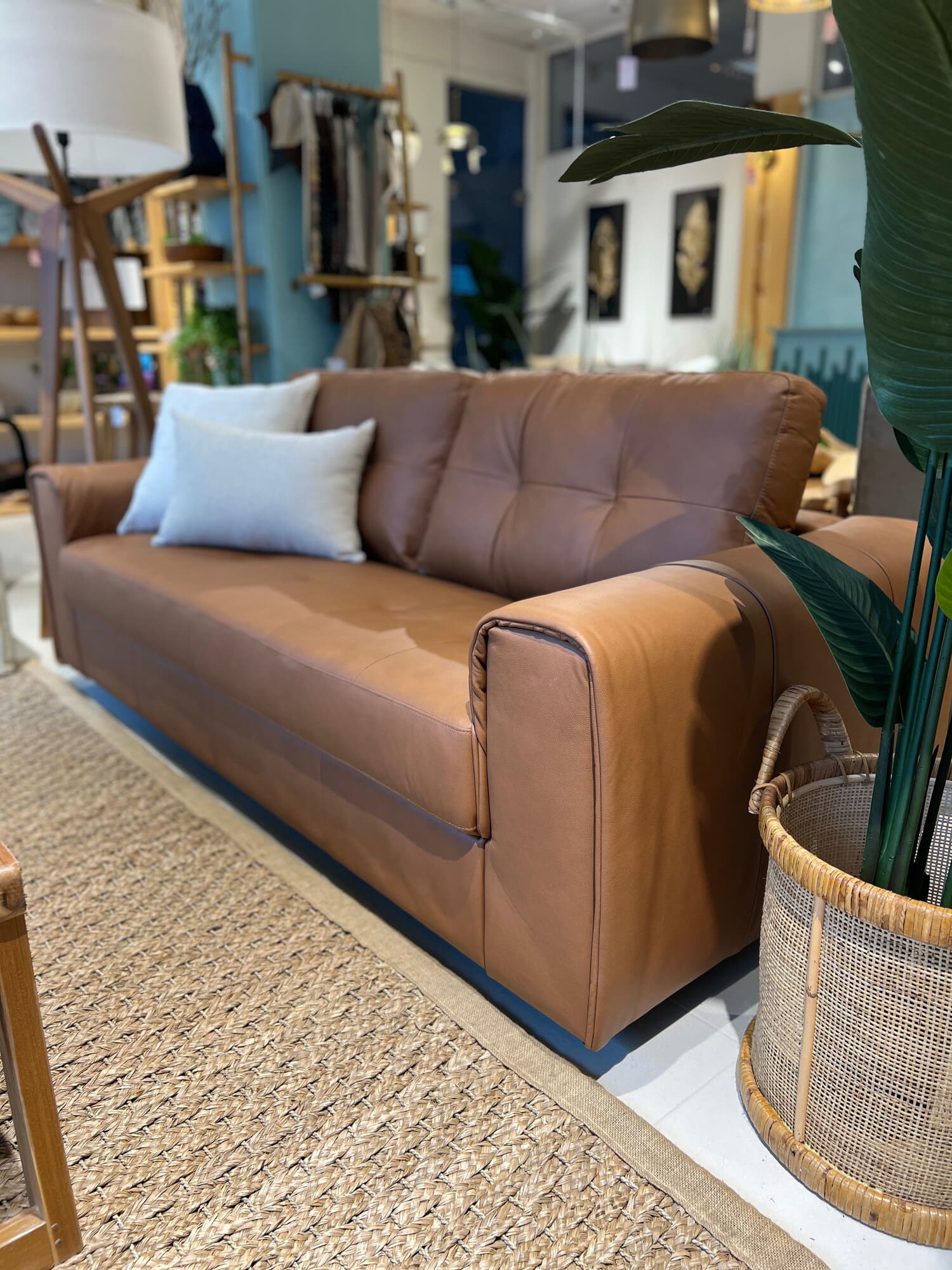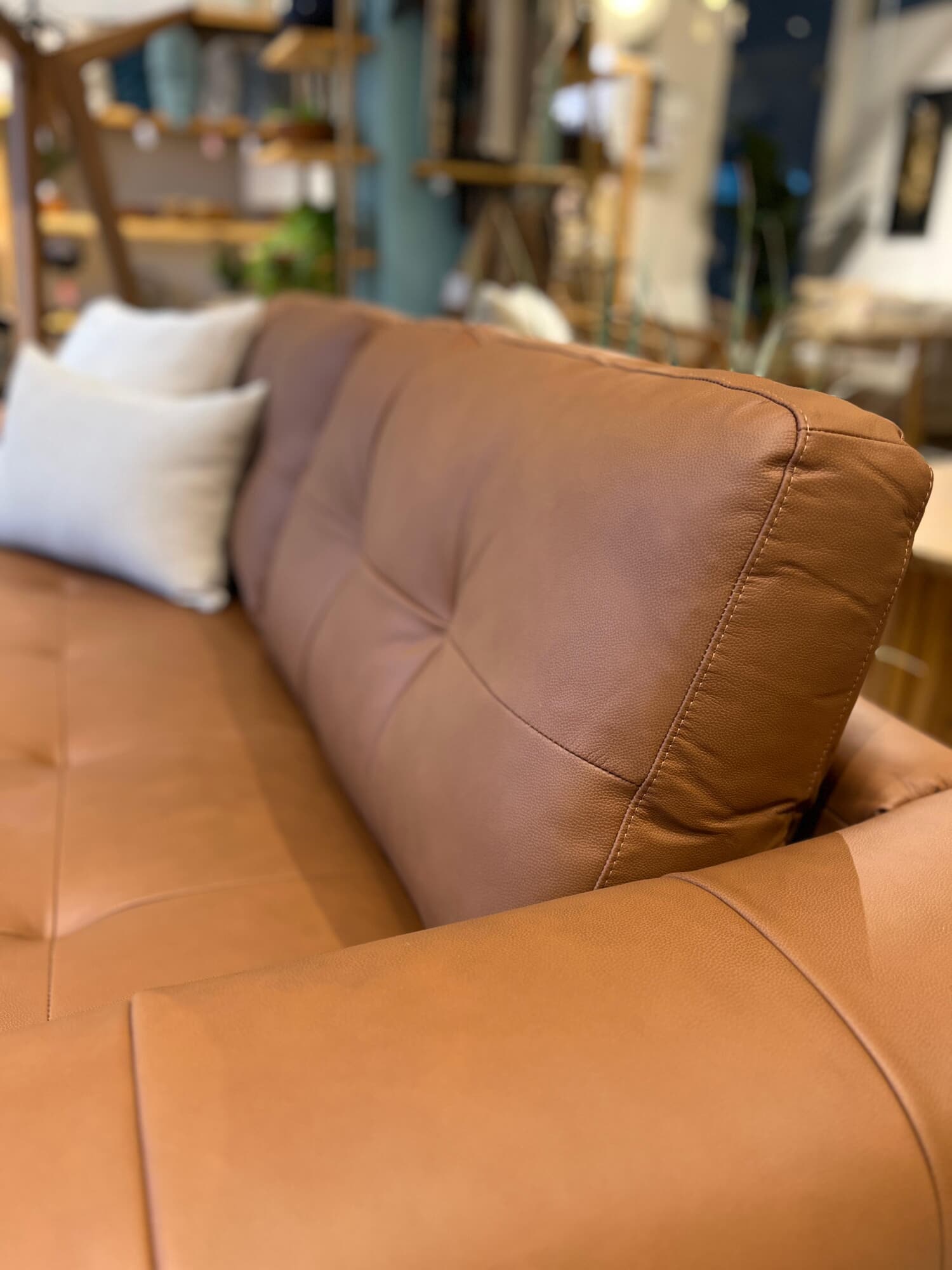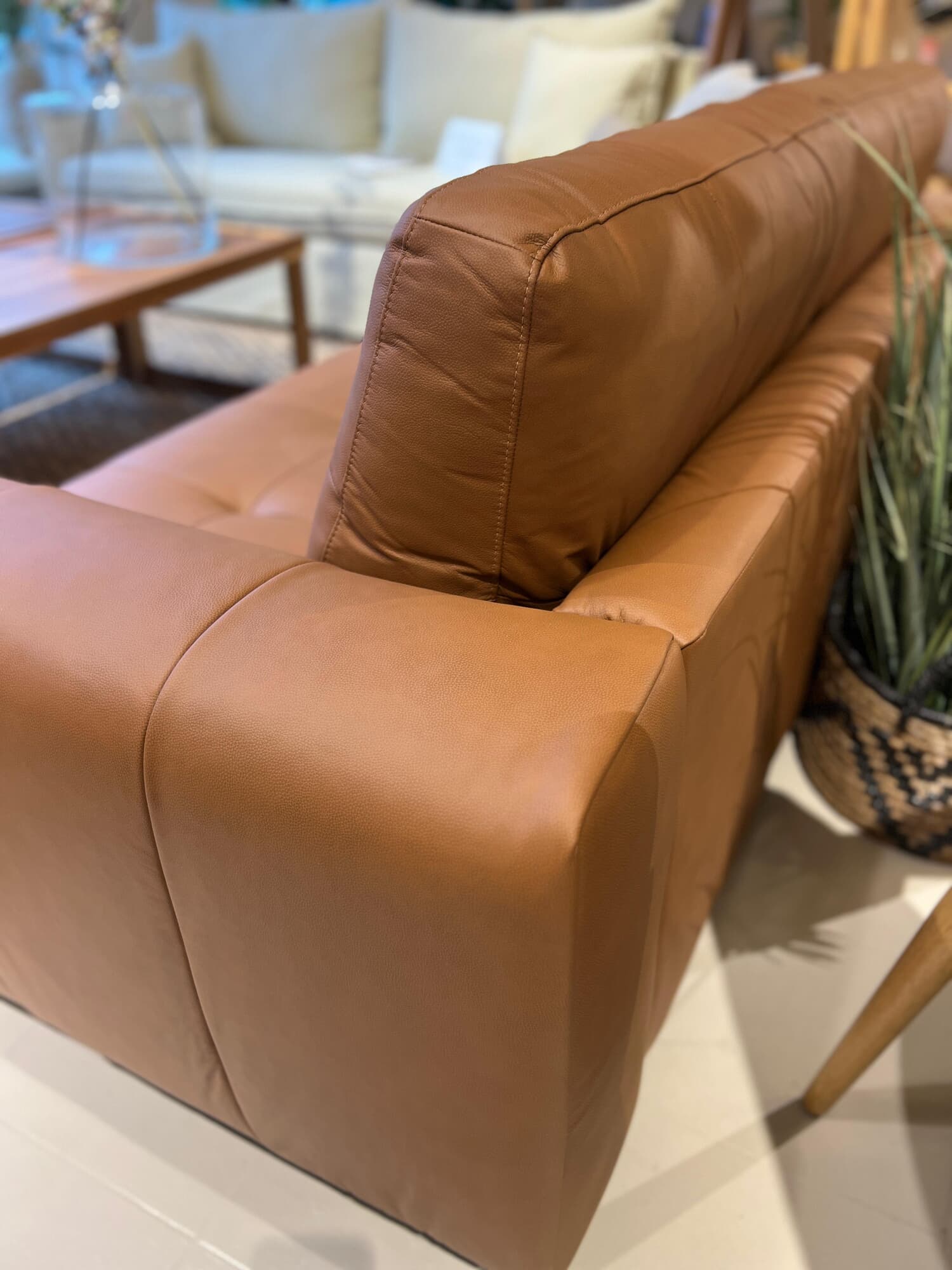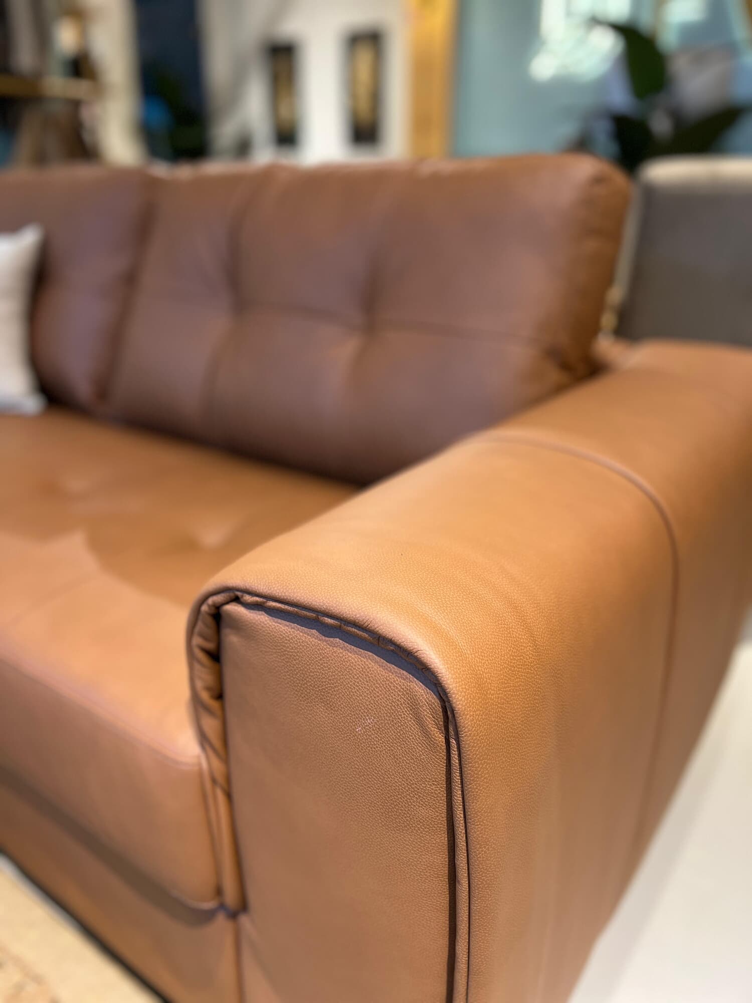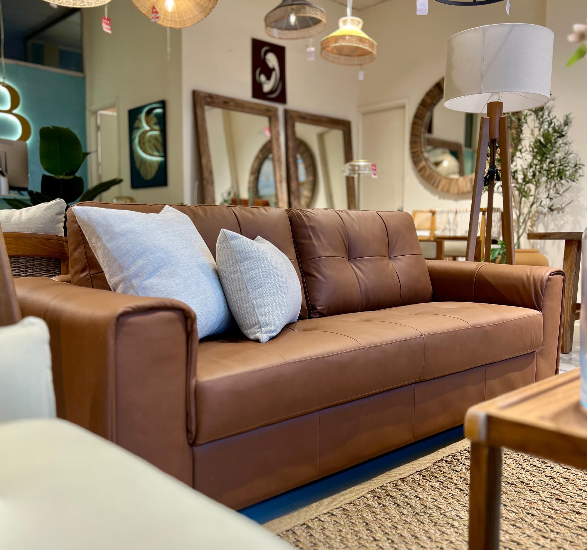 Estructura de madera maciza relleno de espuma de alta densidad y fibra siliconada, tapizado 100 % en cuero genuino.